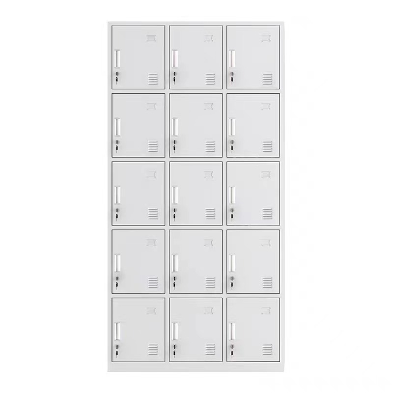 The 15 Locker Storage Cabinet is a durable and secure storage solution ideal for offices, schools, gyms, and industrial spaces. Made from high-quality steel with a powder-coated finish, it resists rust, corrosion, and scratches. Each of its 15 compartments features an individual lock for privacy and ventilation slots for airflow. Its compact yet spacious design maximizes storage without taking up too much space. Adjustable shelves and reinforced doors add extra durability and versatility. Easy to assemble and low maintenance, this cabinet provides a reliable way to store uniforms, bags, books, and tools, ensuring security, organization, and convenience in any setting.