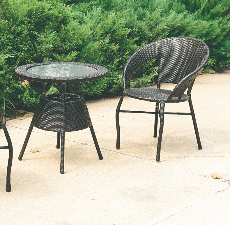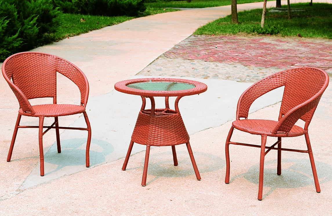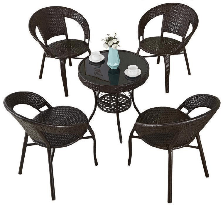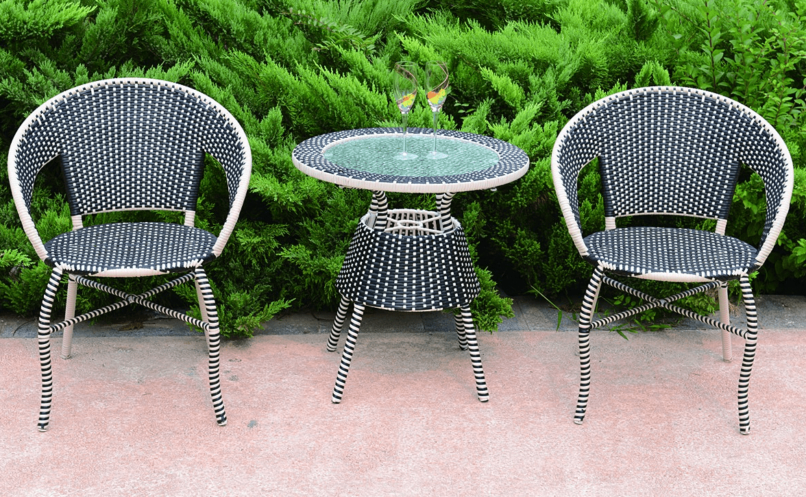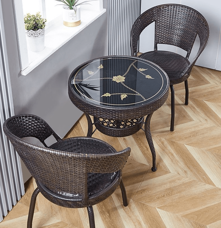 The matching table is crafted from durable rattan and often comes with a tempered glass top for easy cleaning and a polished look. Its compact design is ideal for intimate spaces without compromising stability or style.