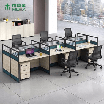 - 4-person cubicle workstation designed for team collaboration
