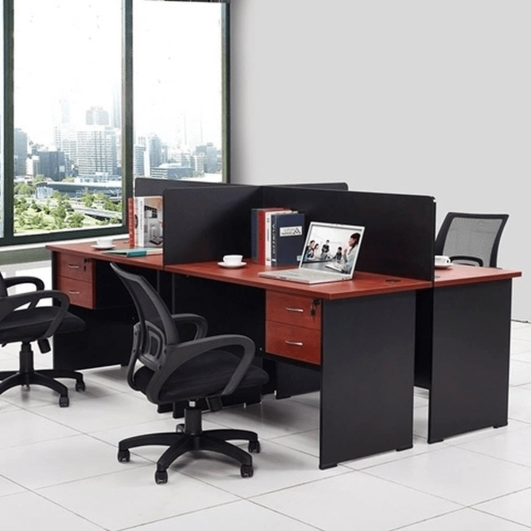 Each of the four individual desks provides ample space for monitors, laptops, documents, and office essentials. Integrated partition panels help maintain personal work zones without sacrificing team connectivity. Optional under-desk storage, cable management features, and modular add-ons further enhance organization and efficiency.