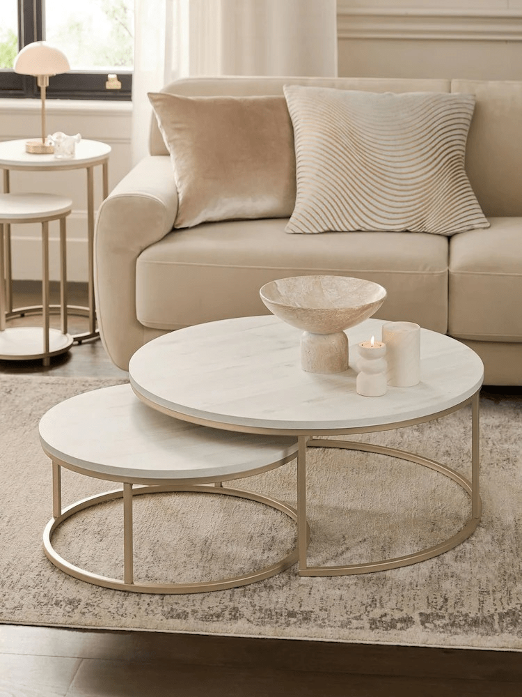 These nesting tables offer versatile functionality. Use them together for a layered, multi-dimensional centerpiece, or separate them to serve different areas of your living room. The smaller table tucks effortlessly under the larger one, allowing you to save space without compromising on style.