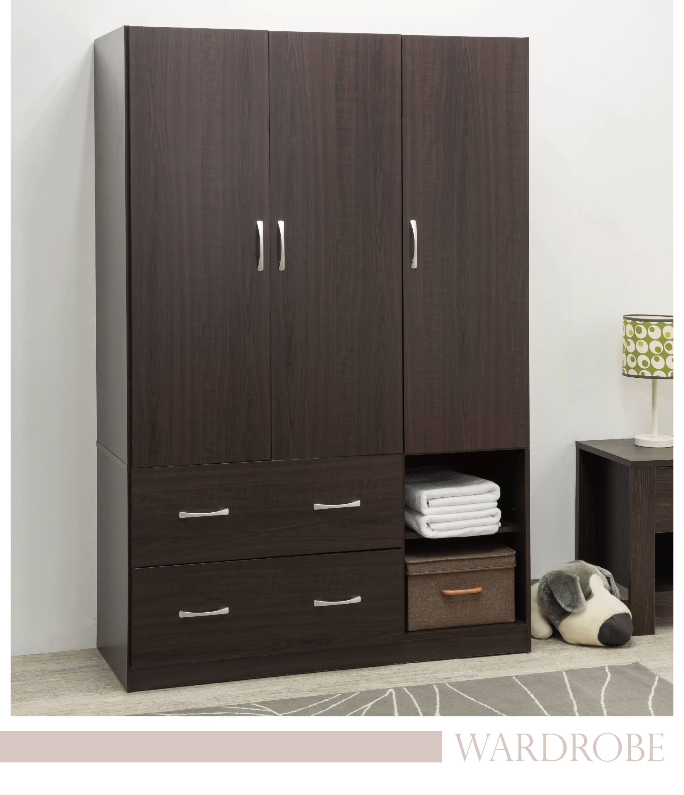 Designed to meet all your storage needs, the closet features multiple shelves, hanging rails, and roomy compartments. It allows you to neatly organize clothing, shoes, accessories, and linens, helping you maintain a clean and clutter-free bedroom.